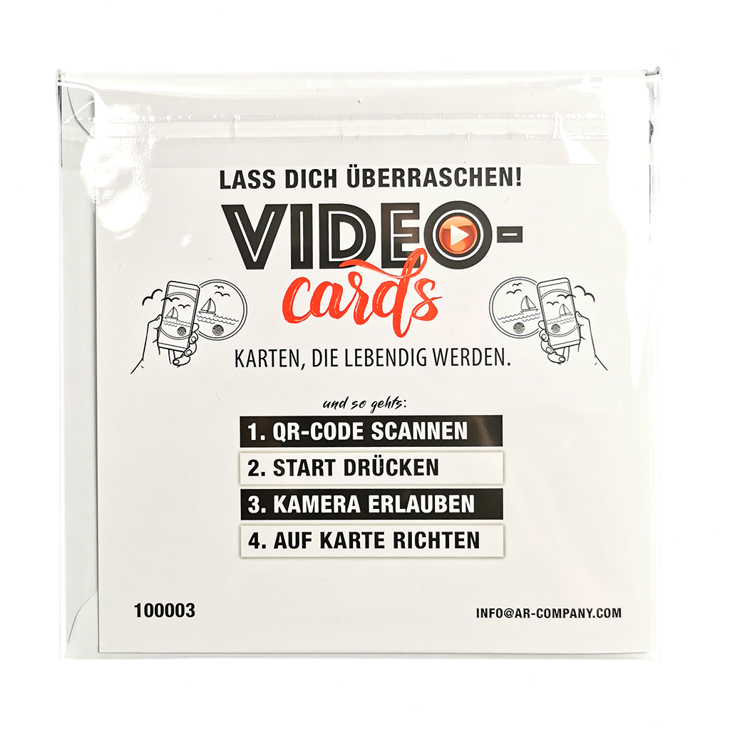 Überrasche deine Liebsten mit unseren **animierten Grußkarten** im handlichen quadratischen Format (15 × 15 cm). Jede Karte kommt als elegante Klappkarte inklusive Umschlag. Scanne einfach den QR-Code mit der Kamera deines Smartphones und erlebe, wie eine Animation in Augmented Reality (AR) lebendig wird – ganz ohne App.